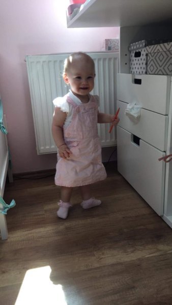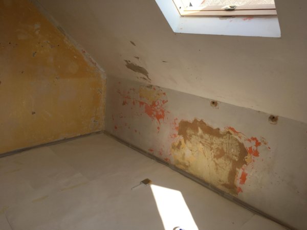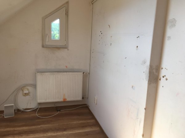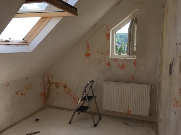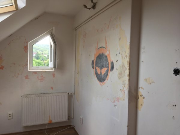Judit: A leendő babaszoba korábban egy kisfiú szobája volt, de csak nappal használta. Amikor a falakat levakartuk, csúnya rajzok kerültek elő, melyeket utolsó centiig eltüntettem, mielőtt rá lett alapozva.