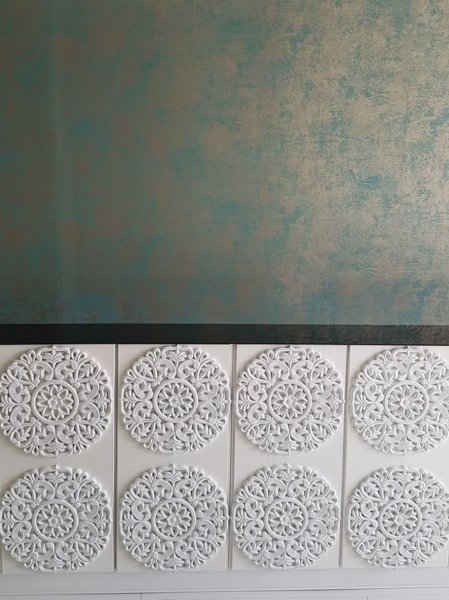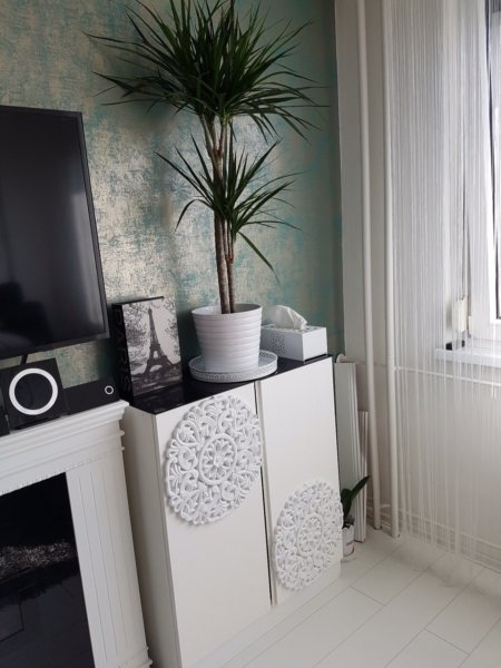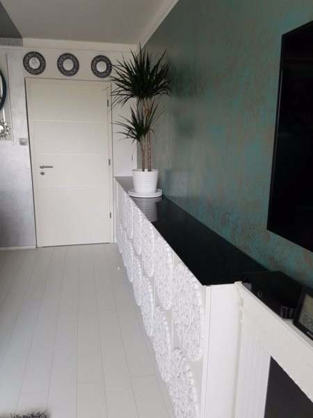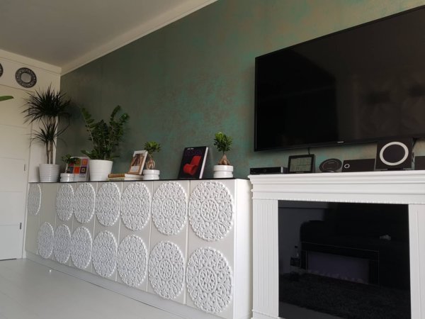 Következő lépésként 10 cm-es szegőléccel beburkoltuk a lábakat és felfúrtuk rá a Mömax-ban készen kapható rozettákat. Mivel túl nőies irányt vett így a szoba, a tetejére méretre készített fekete matt üveglap, majd rajta dísztárgyak – amik még váratnak magukra – fogják a maszkulin vonalat képviselni a szobának ezen a térfelén.