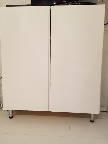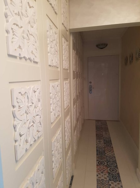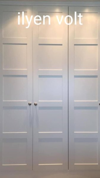 Az IKEA Pax fehér gardróbvázakra szintén az üzletben kapható Bergsbo nevű ajtók kerültek. Ezekre kétoldalú ragasztóval és Patex-el rögzítettük a Mömax által faliképnek forgalmazott por festett fehér, illetve por festett fehér és koptatott faragott mintákat. Elég nehéz hozzájutni, mi fél évig vadásztuk, amíg az összes minta meglett. Az aljzaton laminált padló van, a fehéret már nem forgalmazzák és nem is gyártják. A színesből csak nagyon keveset vettünk, mert nem olcsó mulatság volt.