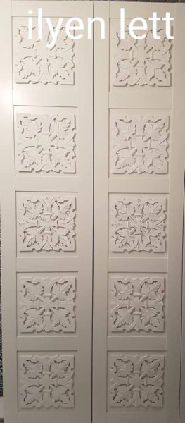 Júlia: Köszönjük. Hasonló technikával készültek az előszobában a beépített szekrények is, ahol az egyszerű tucat IKEA ajtók faragott fa mintákkal lettek személyesebbé téve.