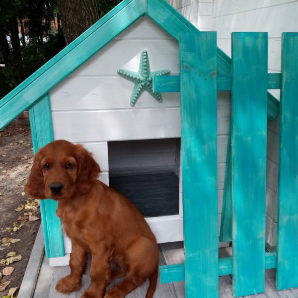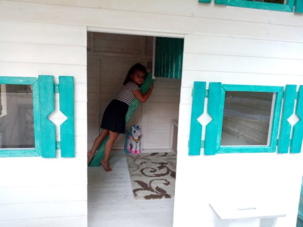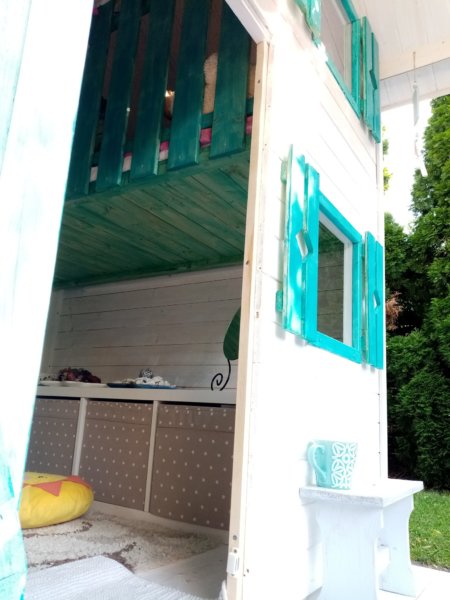 A pihenés és játék színtere lett ez az igazi luxus faház. Stílusában a görög tengerparti vonalat követte az édesanya a fehér és kék színekkel. A ház méretre vágott, előkészített faanyagból készült. Több rétegben lazúrral festett fa, ahol a kék szín antikolása érte el a megfelelő hatást. Mindamellett, hogy egy gyermeknek készült ajándékba, a kert csodálatos ékszere lett. Precízen illeszkedik a természetbe, tényleg egy megvalósult álom a szülők számára is.