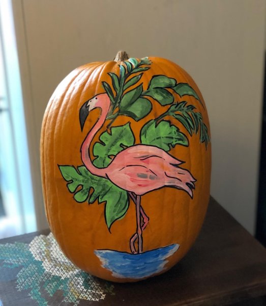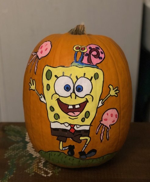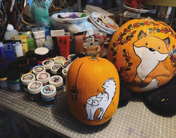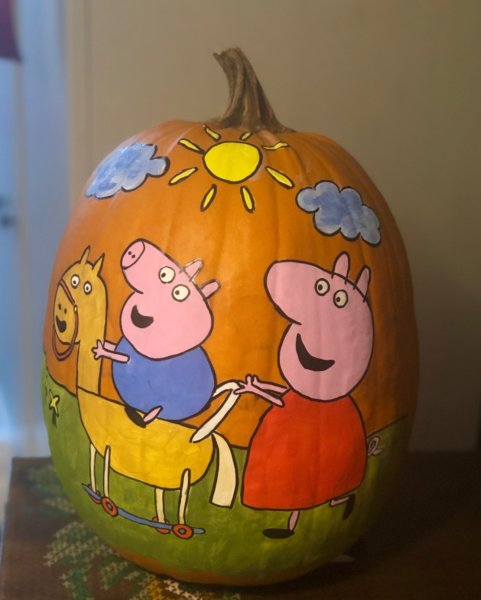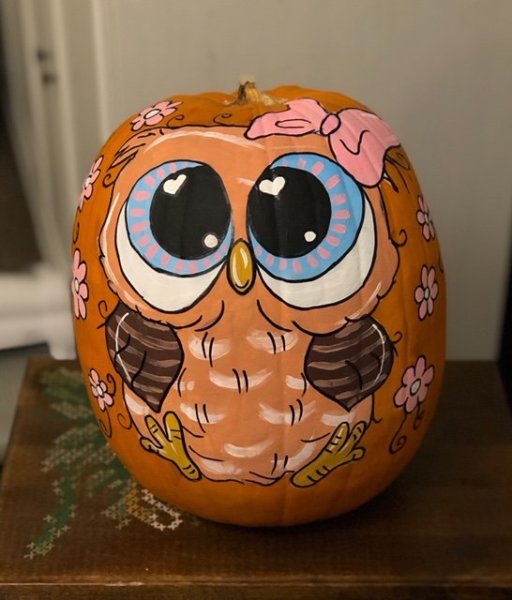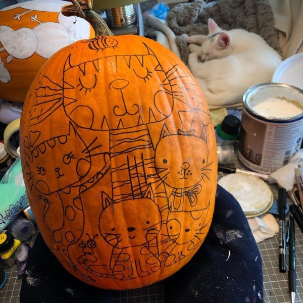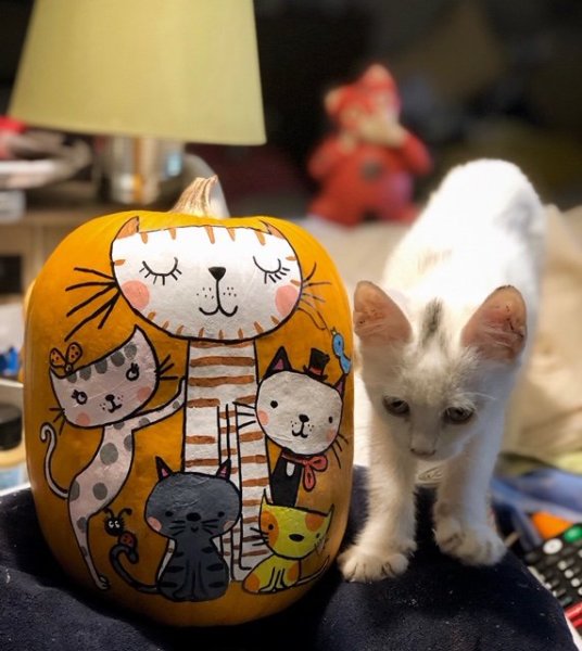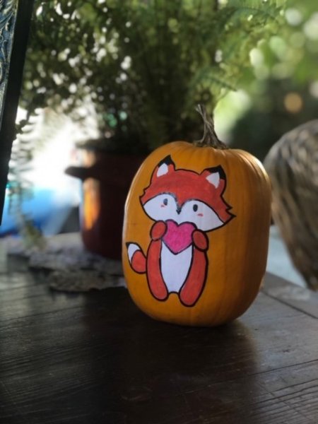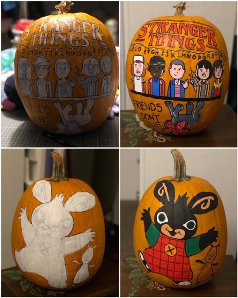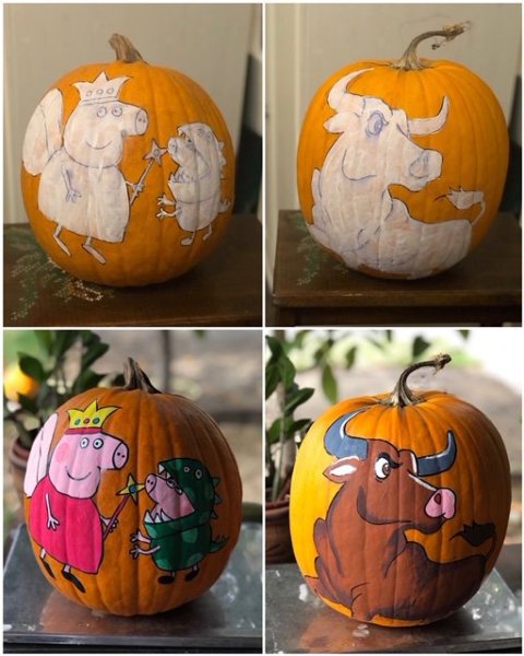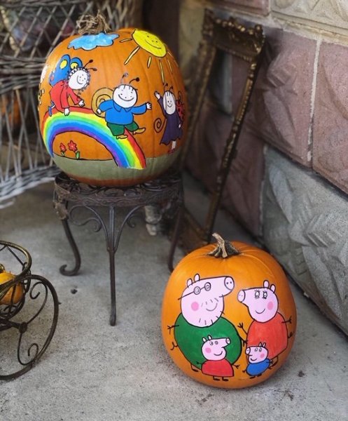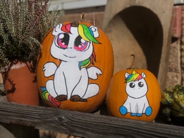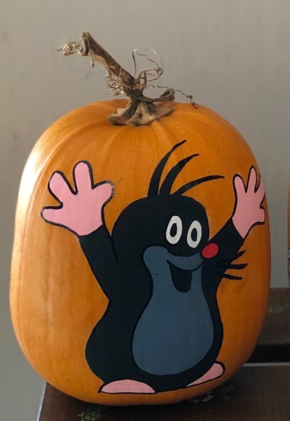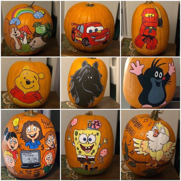 A lenyűgöző képek után nekem is kedvem támadt hozzá, hogy kipróbáljam a festett megoldást, a faragás helyett. Móni volt olyan kedves, és további inspirációként elkészítette nekem a két kedvencemet, melyet már ki is tettünk a bejárati ajtó elé. A gyerekeim imádják ♥